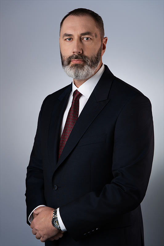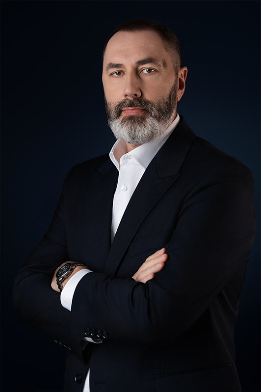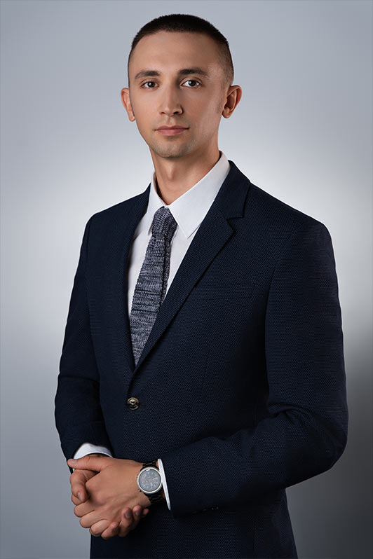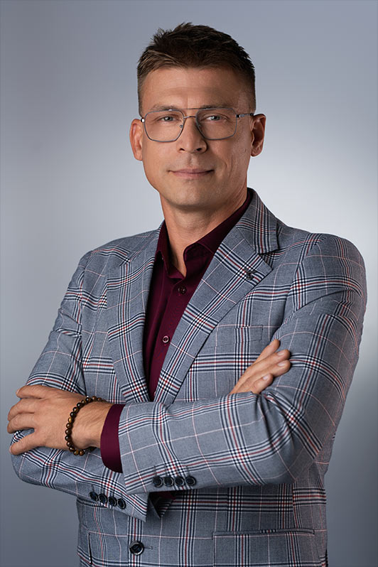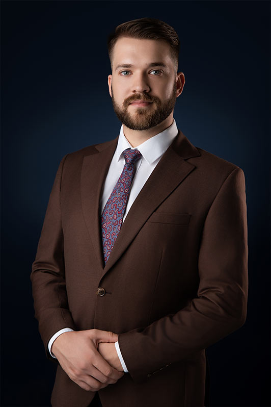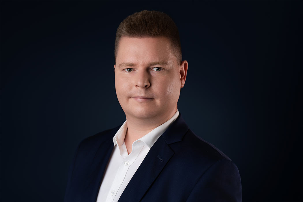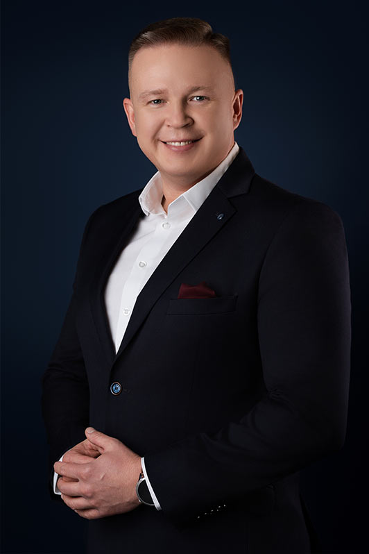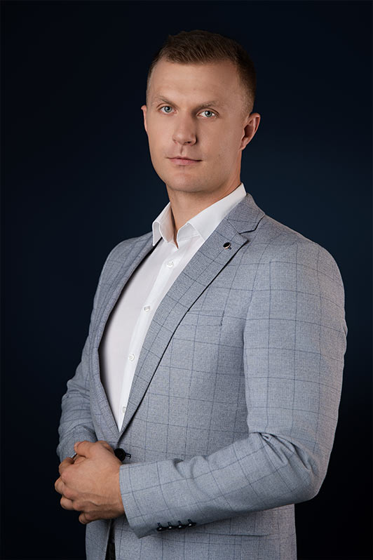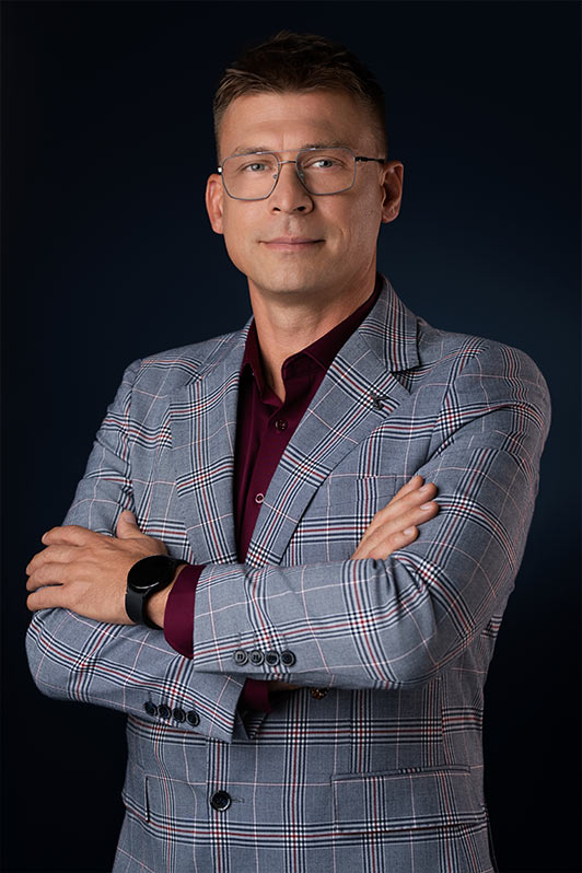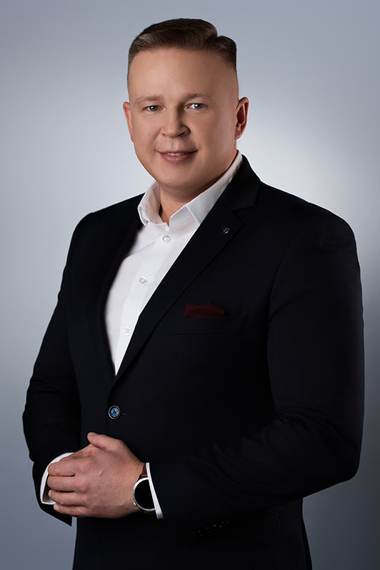 Sesja biznesowa odbyła się w sali konferencyjnej, gdzie rozstawiliśmy profesjonalny setup fotograficzny. Użyliśmy dwóch różnych teł – jasnoszarego oraz granatowego. Granatowy kolor został wybrany specjalnie, aby korespondować z identyfikacją wizualną firmy, która specjalizuje się w rozwiązaniach oświetleniowych.