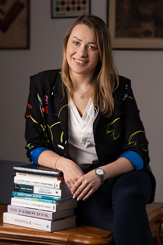 Sesja zdjęciowa odbyła się w komfortowych wnętrzach, gdzie stworzyliśmy zarówno klimatyczne ujęcia z produktami, jak i zdjęcia na jednolitych tłach, idealne do edycji i wykorzystania w różnych materiałach reklamowych. Katarzyna postawiła na naturalność i profesjonalizm, dlatego zdecydowała się na biznesowy makijaż wykonany przez moją makijażystkę Anię oraz pięć starannie dobranych stylizacji. Ważnym elementem sesji były także okulary, z którymi identyfikują ją pracownicy, a także rekwizyty w postaci notatnika oraz książek o rozwoju biznesu.